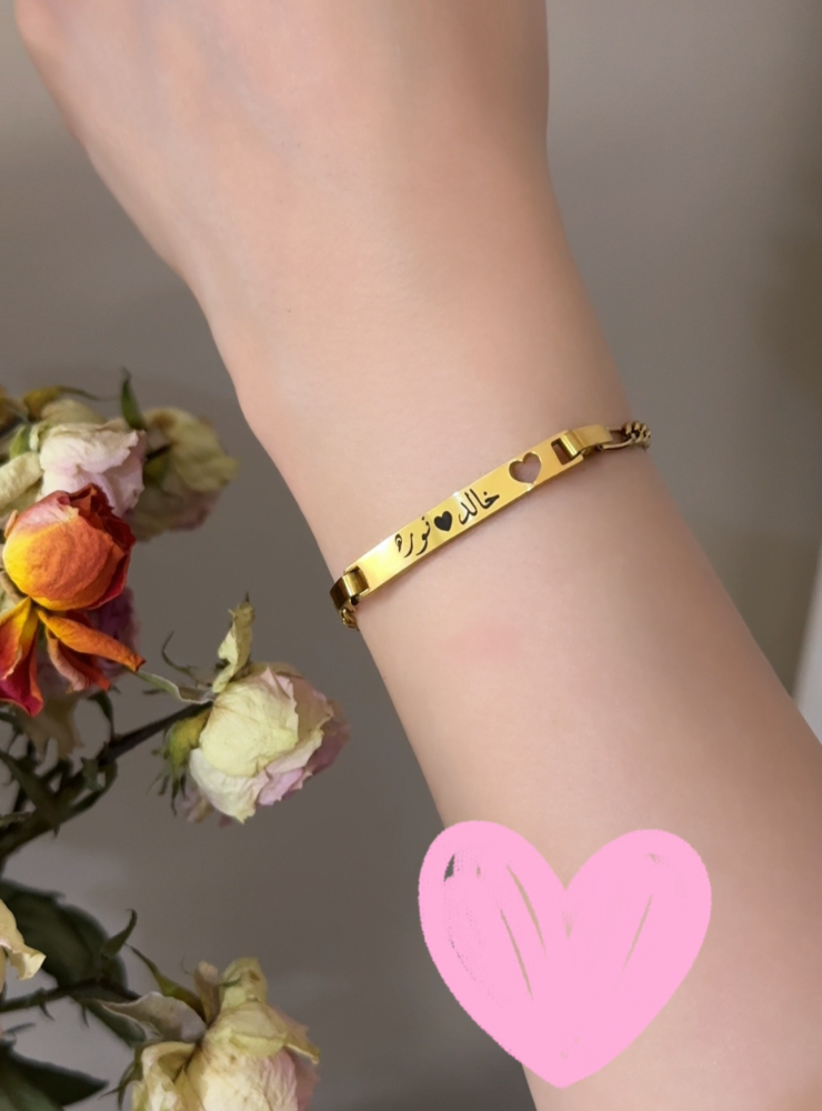تصميم عريض ، وبه الاسم ونقش القلب، مطلي بالذهب عيار 21.